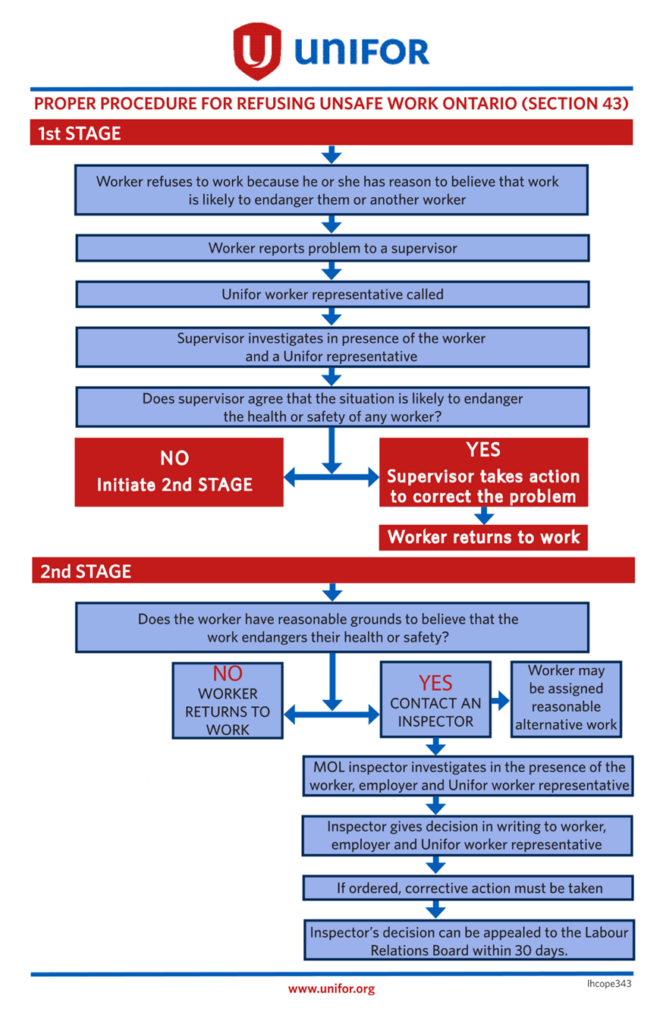 The three main rights that workers have under the Occupational Health and Safety Act (O.H.S.A.) are the right to know about workplace hazards, the right to participate in health and safety discussions, and the right to refuse work that they believe is unsafe. When the I.R.S. has failed or you are faced with a dangerous situation, you may be forced to refuse unsafe work under the O.H.S.A. The following chart explains the proper steps to be taken.