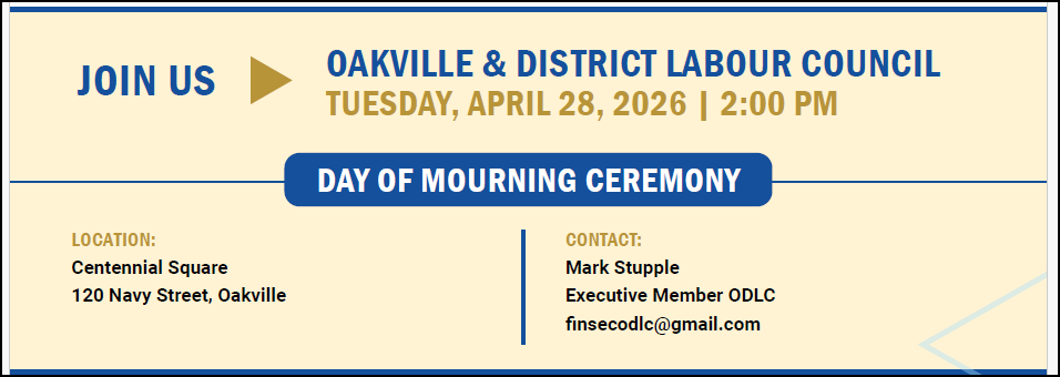 If you have time on April 28, at 2 pm, please join us at Centennial Square in Oakville (Oakville Public Library) and show support for this ongoing battle. Until we report zero deaths at workplaces across the country, we will continue to bring attention to this cause.