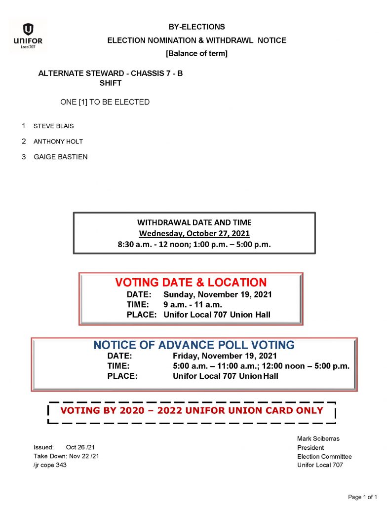 By-Election Alternate Steward – Chassis 7- B Shift