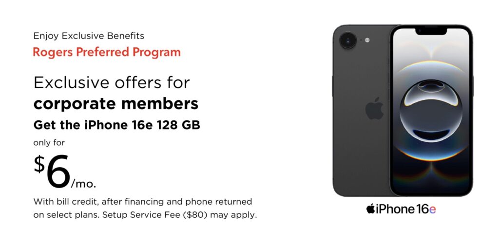 Enjoy Exclusive Benefits Rogers preferred program Exclusive offers for corporate members Get the iPhone 16e 128 GB for $6/mo.
